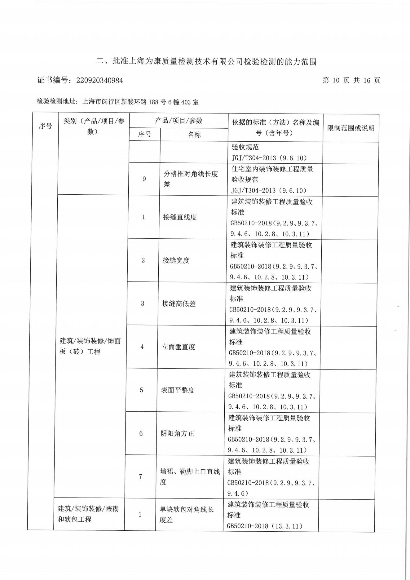 分戶驗收要求 分戶驗收:即交房前依照相關標準對區域內住宅逐套進行驗收。自2009年10月1日起所有上海市住宅工程強制實施分戶驗收?!渡虾J泄こ藤|量分戶驗收管理規定》住宅工程竣工驗收前必須依照《住宅工程套內質量驗收規范》DG/TJ08-2062-2009和現行工程質量標準、規范,對每戶套內的觀感質量、使用功能及使用安全進行驗收。凡未實施分戶驗收的,該工程項目將不得交付使用;服務范圍 一、裝修房全過程跟蹤檢查:從毛坯到裝修結束全過程跟蹤檢驗;對隱蔽工程施工進行檢測;對裝飾 材料進行控制;每個施工節點作好原始記錄并提出整改意見;待整改結束進行復查,直至符合 要求;最終每戶出具一份檢測報告。 二、裝修房竣工驗收:主要對安全、使用功能及表面觀感質量進行檢測;每個施工節點作好原始記錄并提出整改意見;待整改結束進行復查,直至符合要求;最終每戶出具一份檢測報告。 三、毛坯竣工驗收:主要對安全、使用功能及表面觀感質量進行檢測;每個施工節點作好原始記錄并提出整改意見;待整改結束進行復查,直至符合要求;最終每戶出具一份檢測報告。 四、個人交房驗房檢測。 建設工程分戶驗收檢測參考標準 DG/TJ08-2062-2017 《住宅工程套內質量驗收規范 》 DB/T 31/30-2003《住宅裝飾裝修驗收標準》 GB50209-2002《建筑地面工程施工質量驗收規范》 GB50210-2001《建筑裝飾裝修工程質量驗收規范》 GB20242-2002《建筑給排水及采暖工程施工質量驗收規范》 GB50300-2001《建筑工程施工質量驗收統一標準》 GB50303-2002《建筑電氣工程施工質量驗收規范》 套內質量檢測(一房一驗)內容 檢測內容 建筑尺寸 室內地面:水泥砂漿地面、木、竹地板,板塊地面 室內頂棚:頂棚抹灰、吊頂工程 室內墻面:墻面抹灰、飾面板(磚)墻面、涂飾工程、裱糊工程、軟包工程 建筑門窗 樓梯與護欄 細部工程:櫥、柜,窗簾盒、窗臺板、門窗套、可折裝式隔斷、淋浴房 給排水與燃氣:室內給水、室內排水、衛生器具、燃氣管道 通風與空調:送排風和防排煙、空調工程、 室內電氣:燈具安裝、開關、插座,分戶配電箱、室內配線、等電位聯結 弱電工程:有線電視安裝工程、電話、信息網絡安裝工程,訪客對講安裝工程、安防報警系統 太陽能熱水系統 室內環境評價